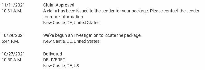 A. 荷物が実際に手元に届くまでは形式上、差出人様側の責任負担となりますので、購入店にご連絡の上、荷物不着の連絡をお願いします。この段階で返金や代替え品の発送を行ってくれるショップも一部ございます。仮に上記の対応が拒絶された場合には、配送会社に対する「調査請求」の依頼をお願いしてください。調査請求は配送各社オンライン上で提出可能です。この調査請求によって荷物が誤配先から回収され倉庫に届くケースもあります。また、誤配が配送会社によって認定された場合には補償金が支払われるケースもあります。下記掲載の画像は、誤配が認定され(Claim Approved)、差出人に補償金が支払われたケースです。